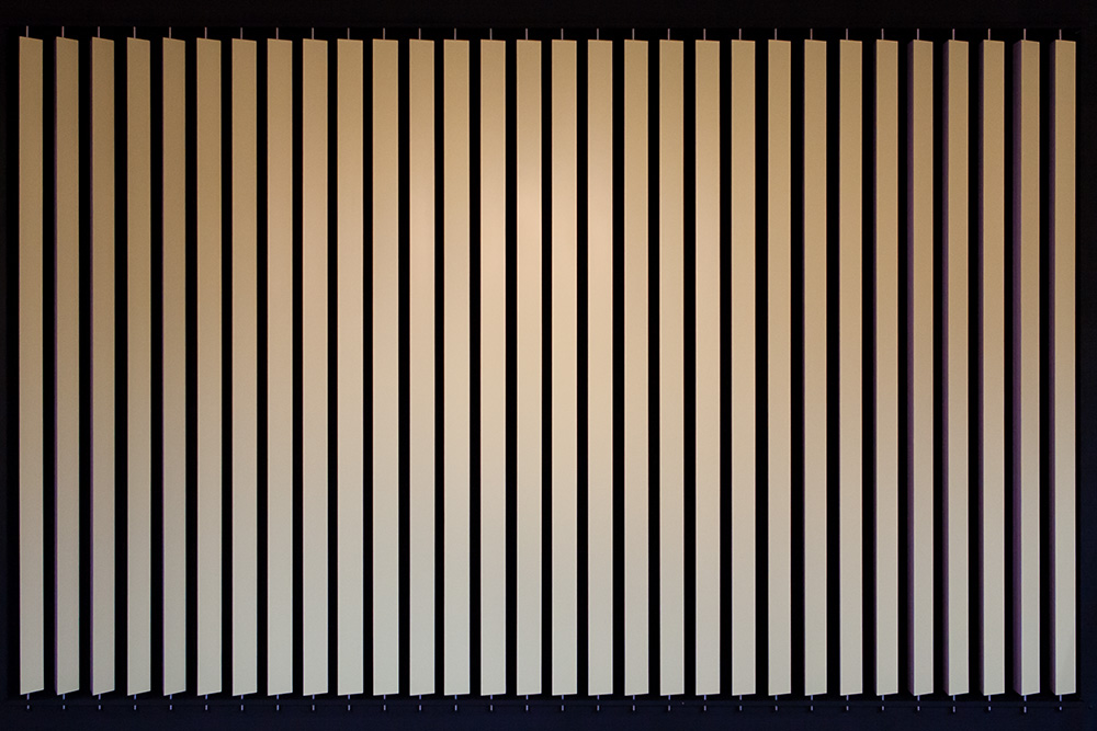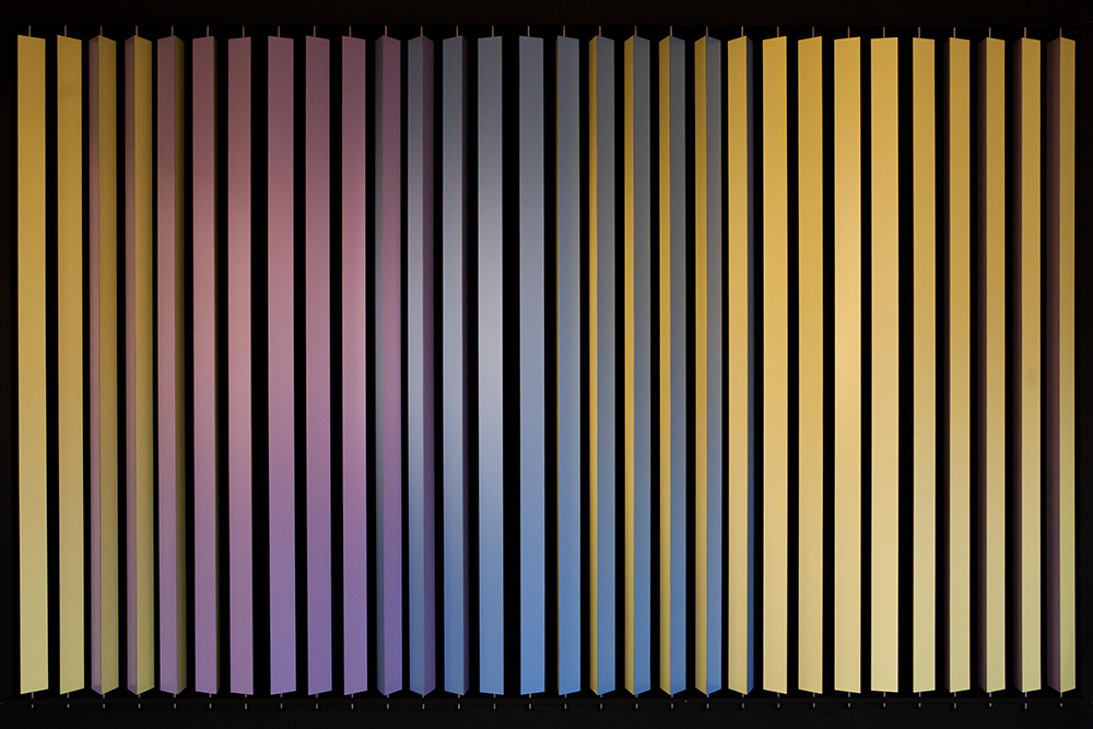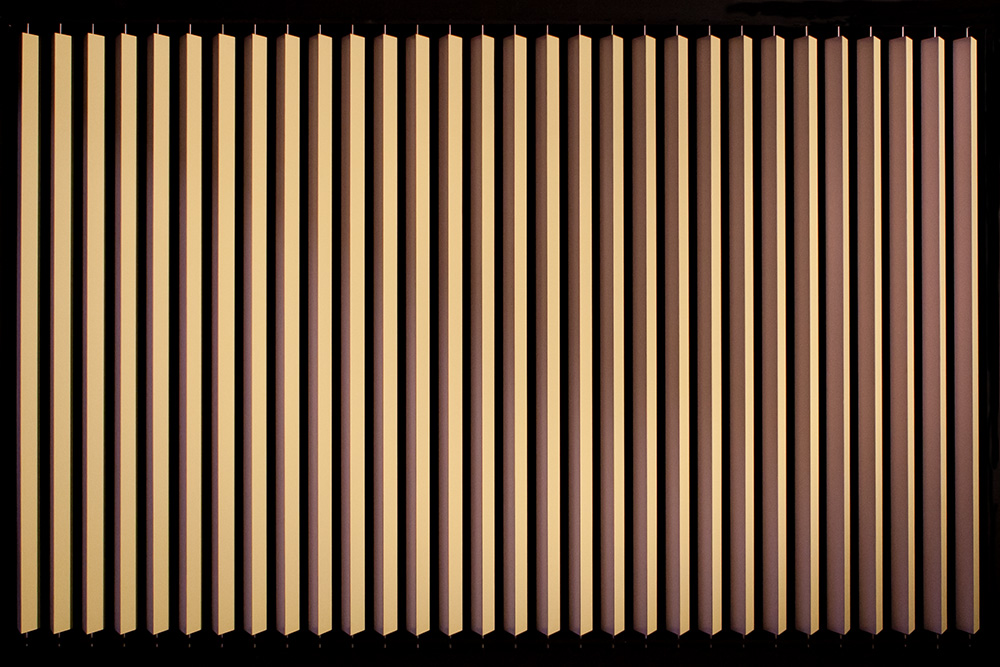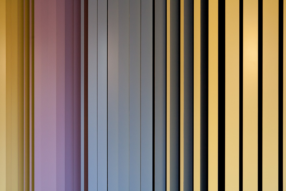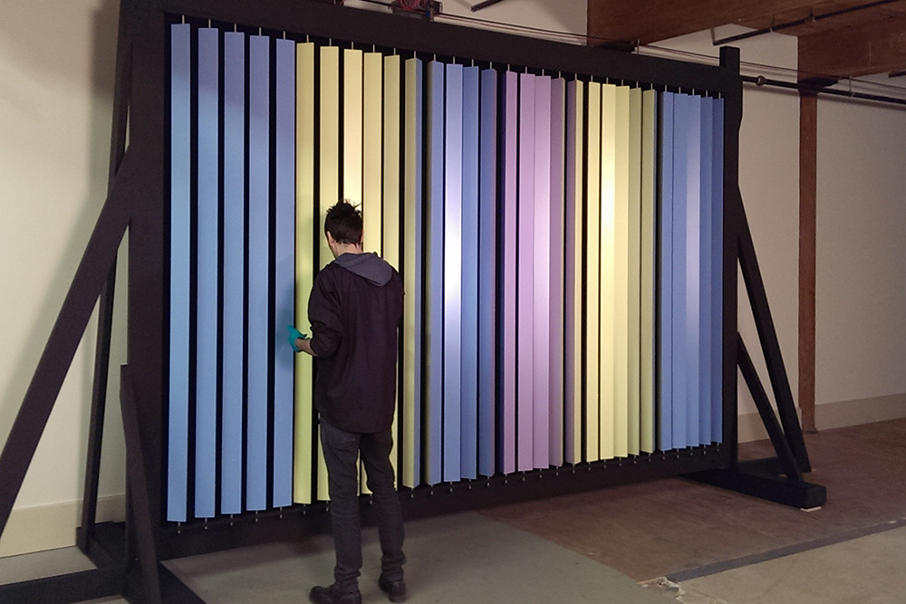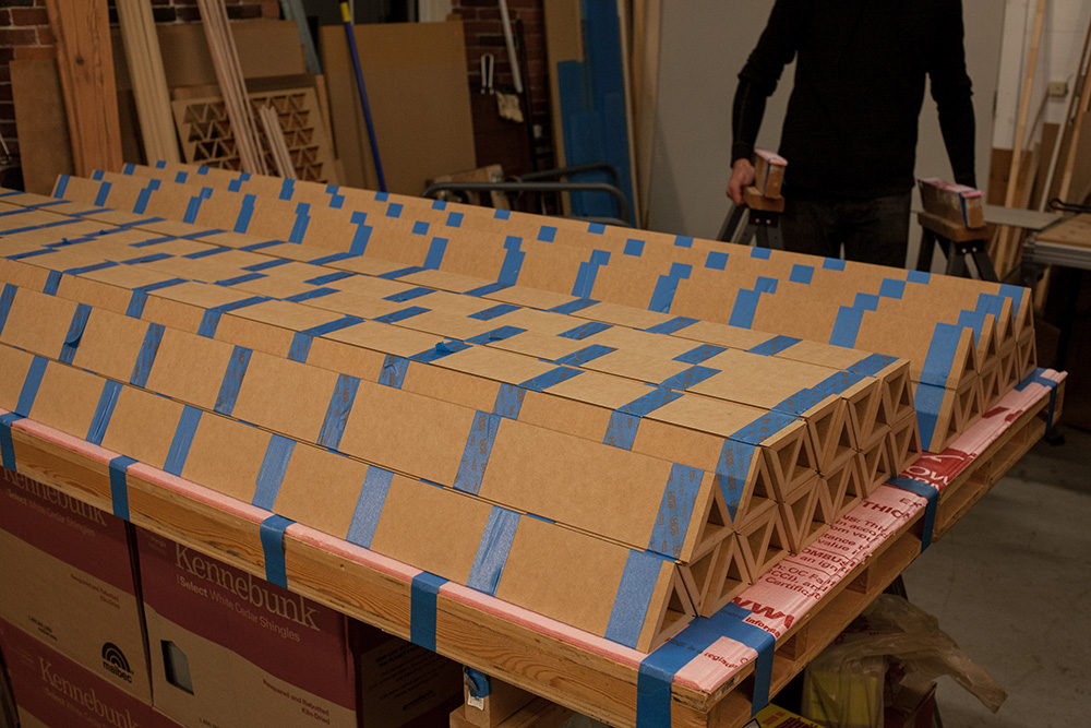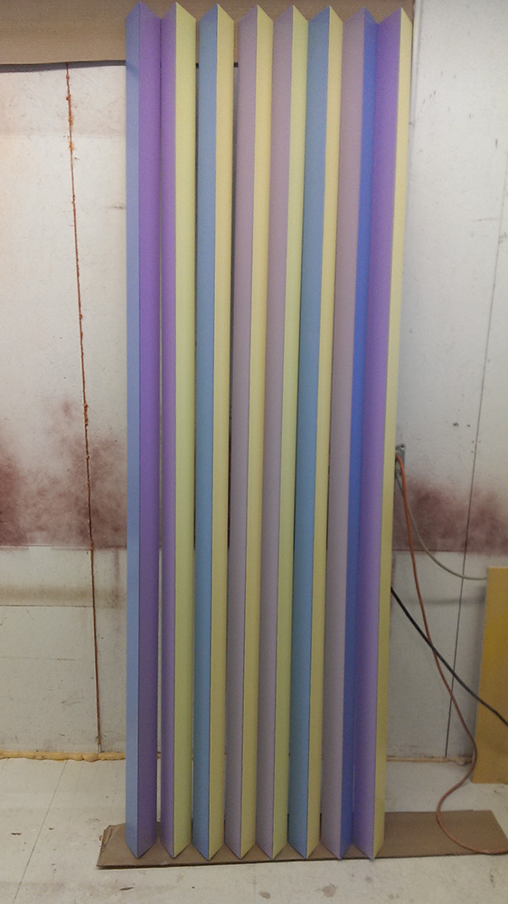 A 1:1 scale fragment visual mockup for testing color and concept. The design was a series of extruded triangular shapes with different colours on three sides. That cover the walls and change direction so that the viewer can see the colours change as they walk around the space. The mockup was designed to be viewed in two ways; as one 7’-8” tier or as three stacked tiers at 23’.