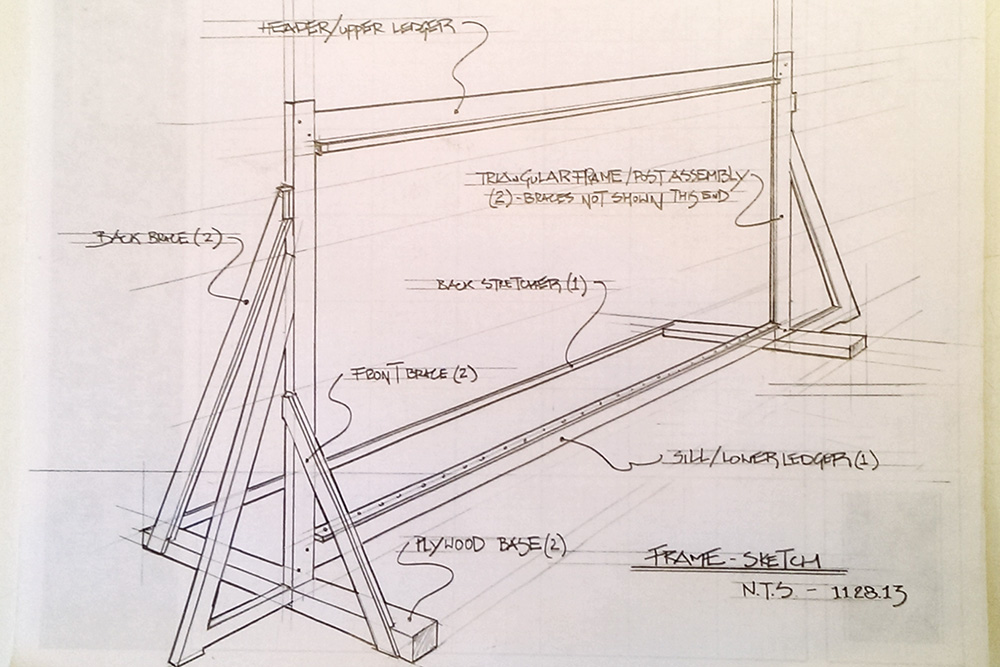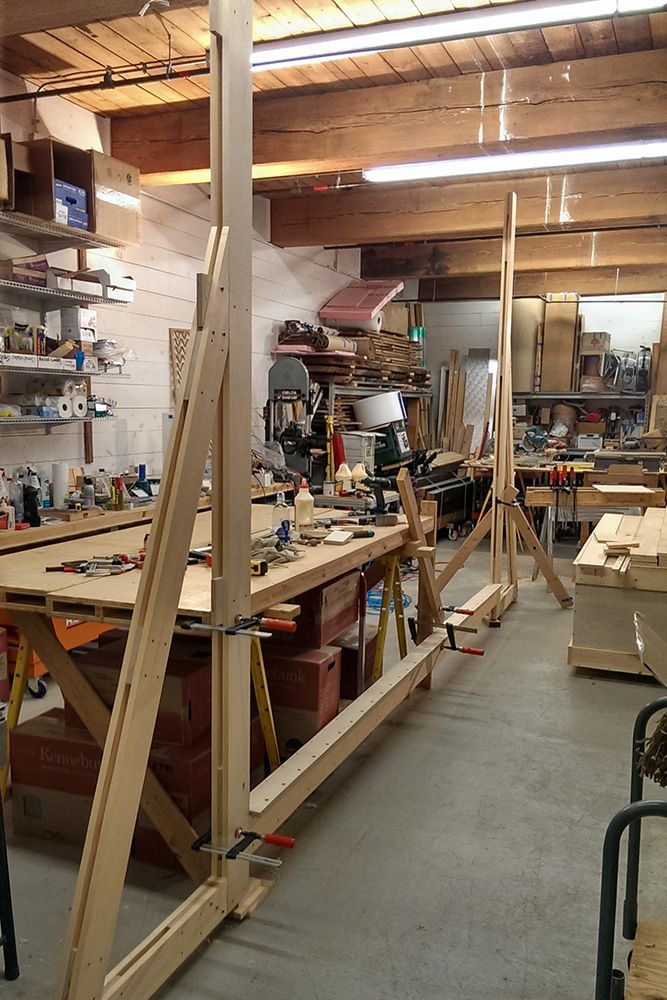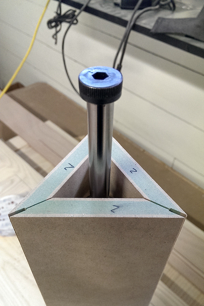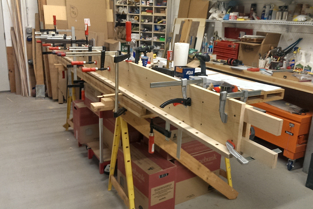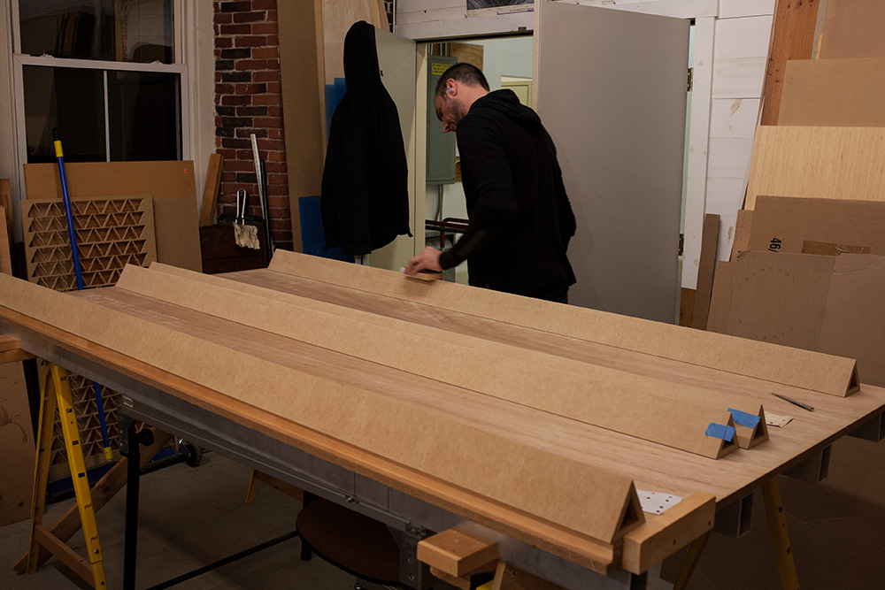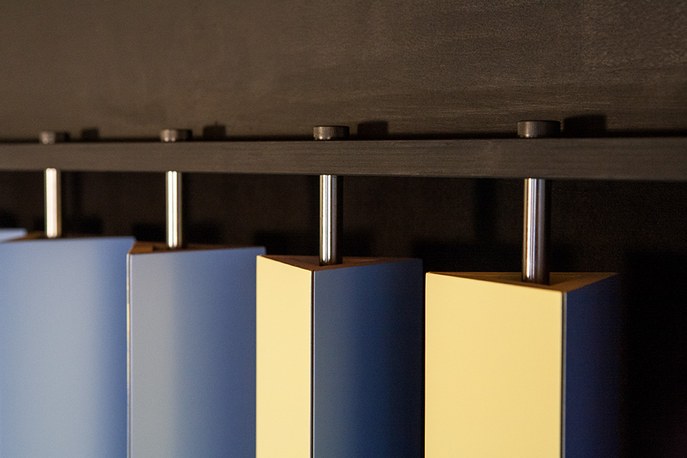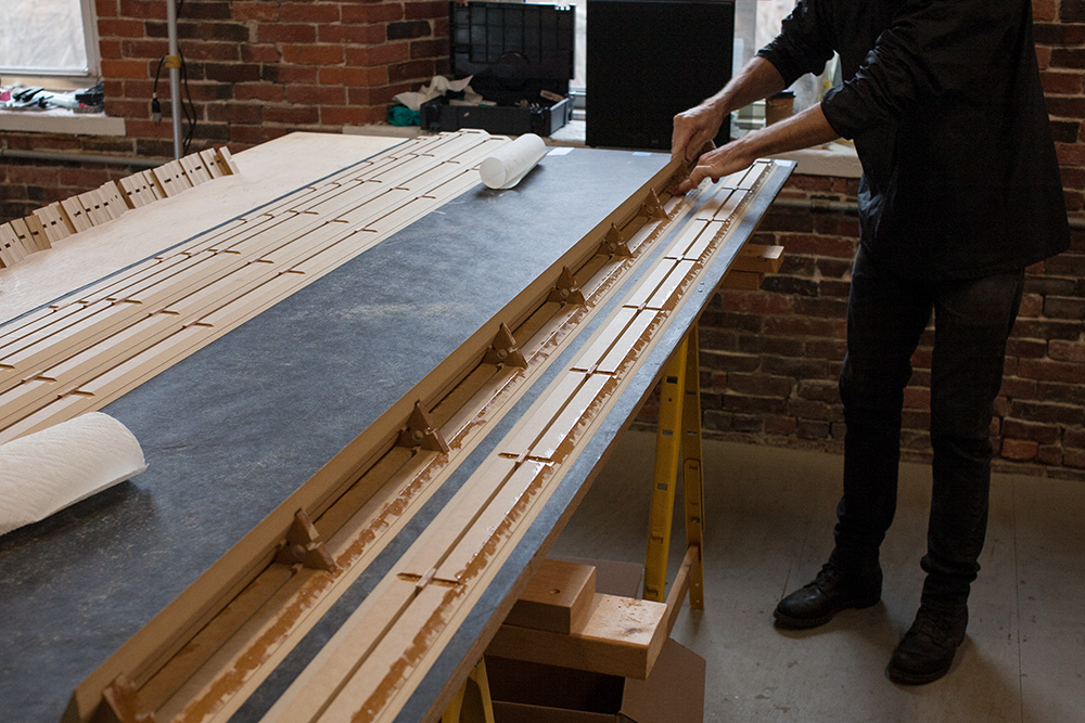 A 1:1 scale fragment visual mockup for testing color and concept. The design was a series of extruded triangular shapes with different colours on three sides. That cover the walls and change direction so that the viewer can see the colours change as they walk around the space. The mockup was designed to be viewed in two ways; as one 7’-8” tier or as three stacked tiers at 23’.