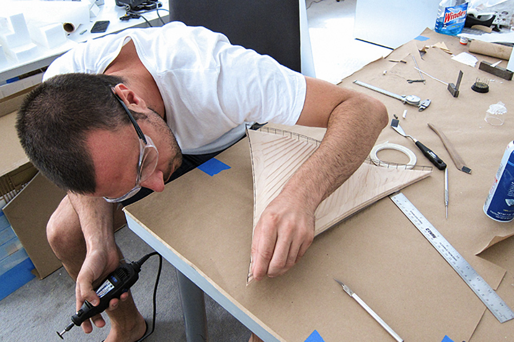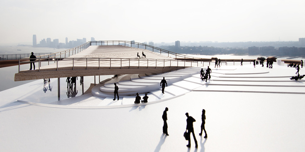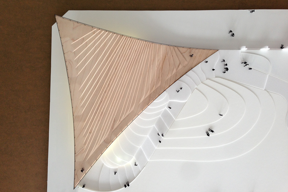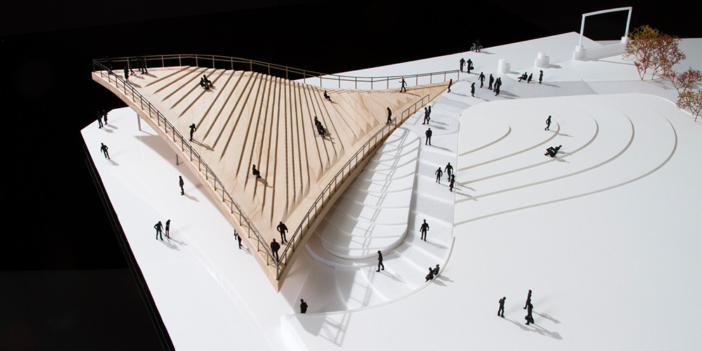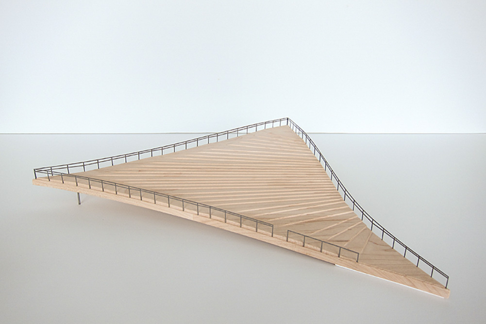 A 1/8” = 1’-0” scale model for a viewing platform in Brooklyn Bridge Park. Our role was to fabricate the maple wood curved triangular shaped form. This consisted of seating, stairs, walkways, support columns and a filigree metal handrail around its perimeter.