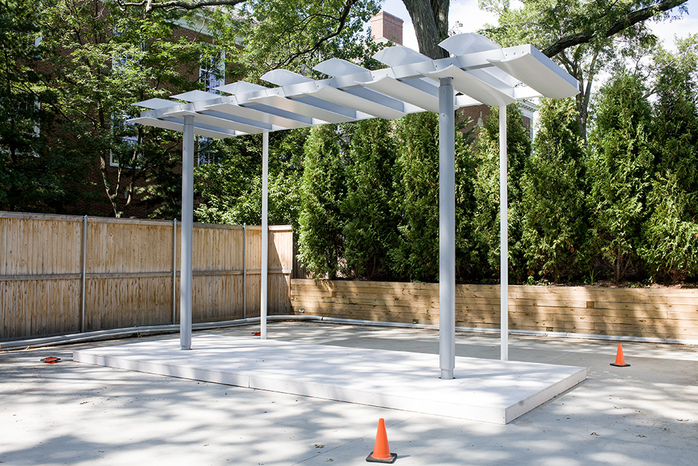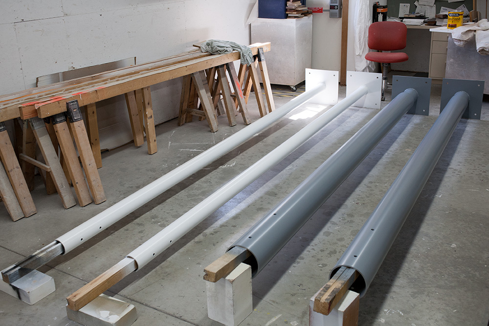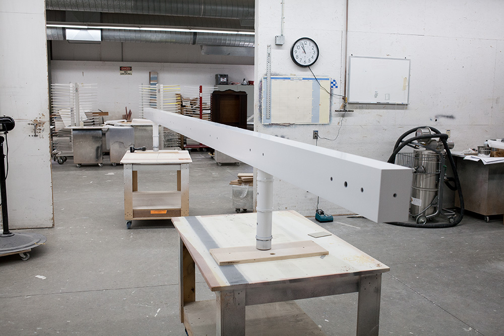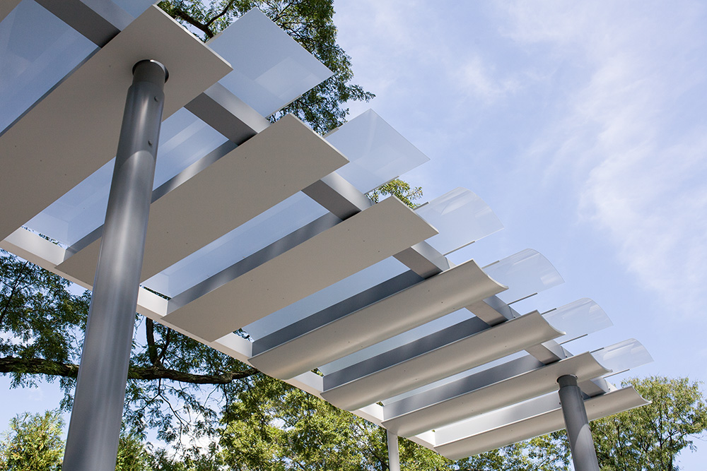 The artwork runs the length of the renovated circulation bridge linking the North Concourse with the newly renovated Terminal 3 and Grand Hall. The luminous volume of the artwork is generated by sunlight entering the bridge’s west-facing window wall and interacting with a matrix of suspended gold and blue hexagonal reflectors, the resulting effects captured by a delicately etched plane of glass.